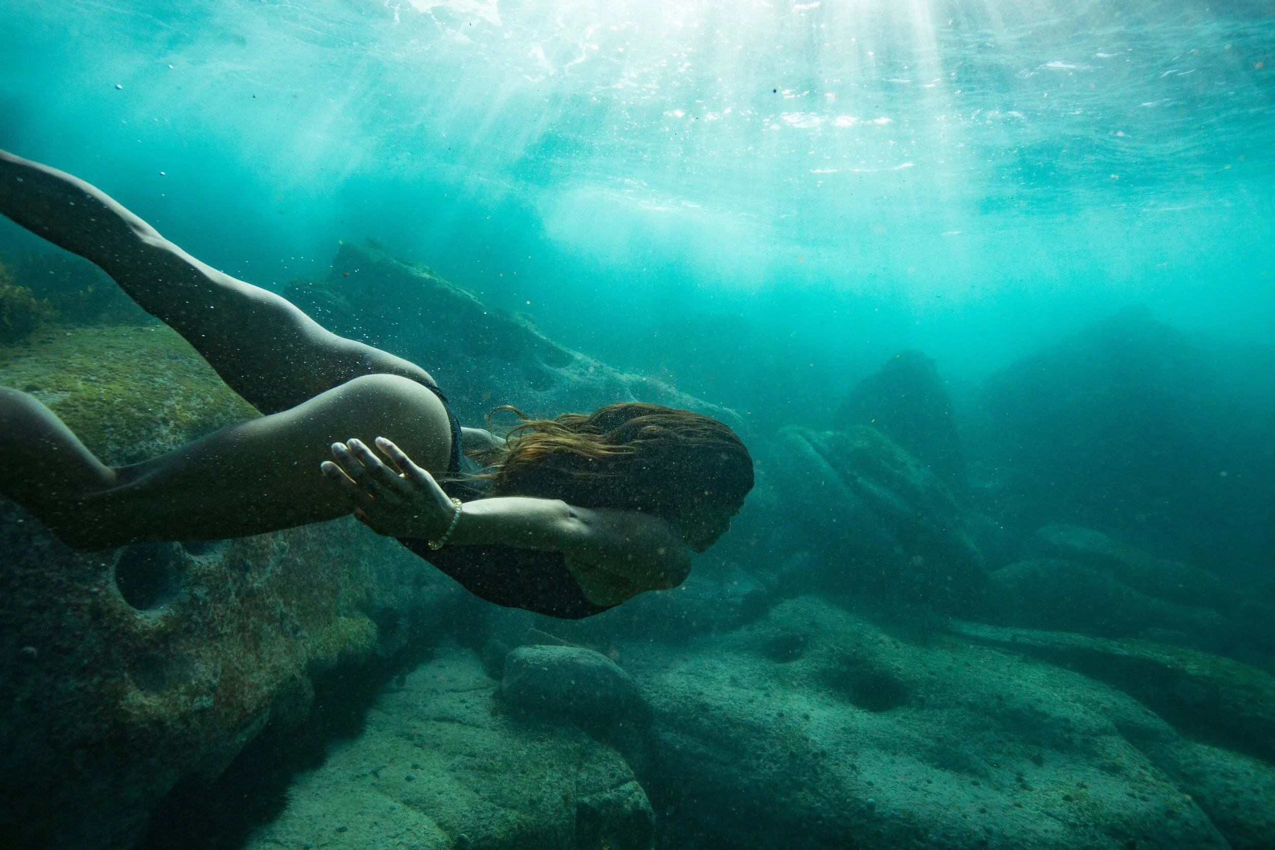 This shoot took place over a sandstone ledge surrounded by kelp forests. Instead of relying on endless visibility, I used the textured environment to create depth and contrast. The subject appears weightless against a natural stage carved by the ocean.